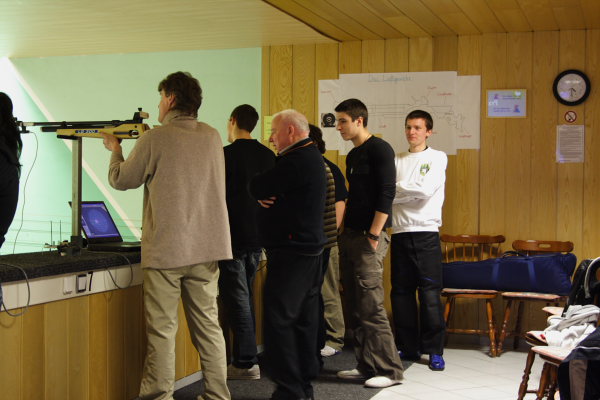Da es sich bei dem Ganzen nicht um eine trockene Veranstaltung handeln sollte waren nun für die Schüler und den Lehrer zwei Scatt-Anlagen vorbereitet an denen sich jeder selber ausprobieren konnte um das eben gehörte selbst zu erfahren. Dabei ergaben sich kleinere Diskussionsgruppen und weitere interessante Entdeckungen waren zu machen. Besonders beeindruckt hat hier wohl der Kleinkalieber 100 Meter Stand. Es ist für Außenstehende schwer vorstellbar auf solche Distanzen noch saubere Ergebnisse zu erreichen.